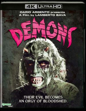 A masked man offers tickets to a horror movie sneak preview at the mysterious Metropol cinema. When a patron is scratched by a prop displayed in the theatre lobby, she transforms into a flesh-ripping demon! One by one, the audience members mutate into horrible creatures hell-bent on destroying the world! Can anyone escape this gory orgy of terror? Regarded by horror fans the world over as one of the greatest Italian splatter films ever made, Lamberto Bava’s Demons is not only major cinematic nightmare fuel, but also a hugely entertaining gore-fest of the highest order. Produced by Dario Argento (Suspiria, Tenebrae, Phenomena), Demons features an amazing soundtrack of 80’s rock/heavy metal music by Billy Idol, Scorpions, Mötley Crüe, Accept, Saxon and MORE!